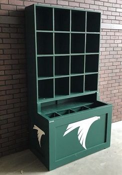 - Features 16 Helmet Cubbies, 4 Bat Compartments and 1 Coaches Storage Cubby