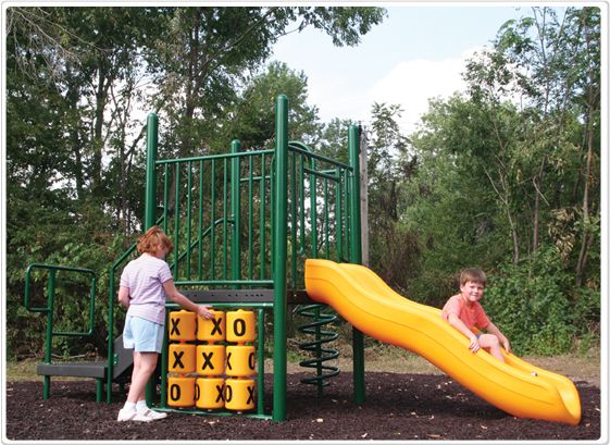 - The Kurt Model Includes Raised Deck with Guardrail, Slide, Tic Tac Toe Panel and Cork Screw Climber